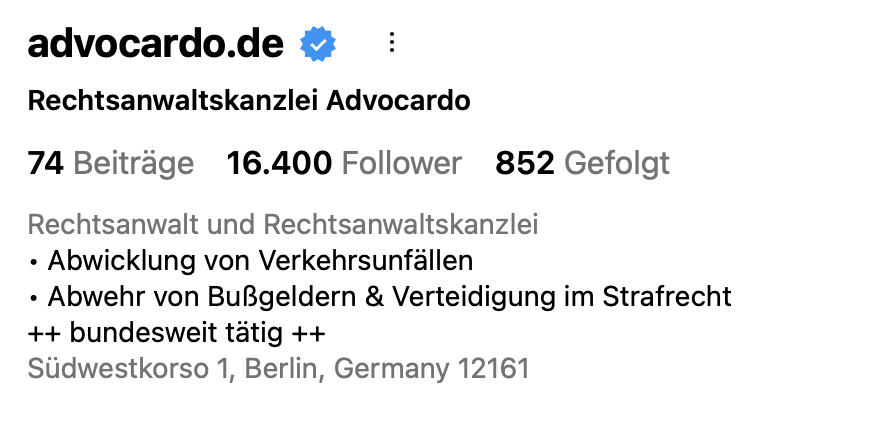 Die Rechtsanwaltskanzlei Advocardo mit Sitz in Berlin bietet kompetente Beratung und Vertretung in den Bereichen Verkehrsrecht, Strafrecht und Zivilrecht. Gegründet von Rechtsanwalt Yalcin Geyhan, legt die Kanzlei großen Wert auf individuelle Betreuung, transparente Kommunikation und eine zielorientierte Lösung Ihrer rechtlichen Anliegen. Ob Bußgeldverfahren, Verkehrsunfall oder strafrechtliche Fragen – Advocardo steht Ihnen mit Erfahrung und Engagement zur Seite.